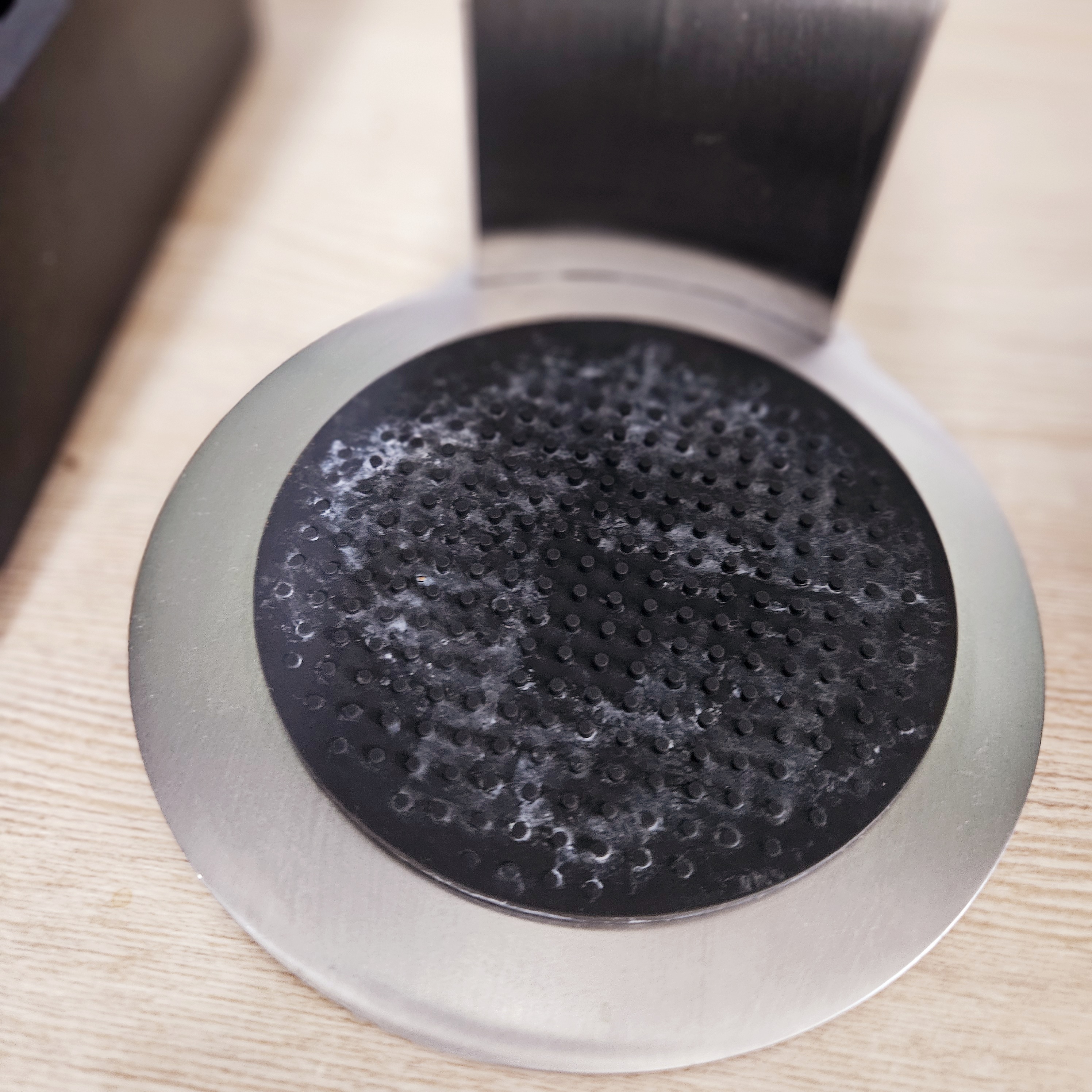 에드학 미스터 브루 필터는 2중 스테인리스로 되어 있습니다. 작게 구멍난 필터+비단결 같이 촘촘한 필터로 이루어져 있어서 커피찌꺼기를 완벽하게 걸러주면서도 금속 맛은 나지 않고 커피 맛이 좋습니다. 참 신기한 구조에요. 그런데 이 2중으로 된 필터가 어긋날 수 도 있기 때문에 연마제 제거 단계부터 살짝 조심해주어야 하는데요. 이에 대한 에피소드는 밑에서 다시 이야기해보도록 하겠습니다.