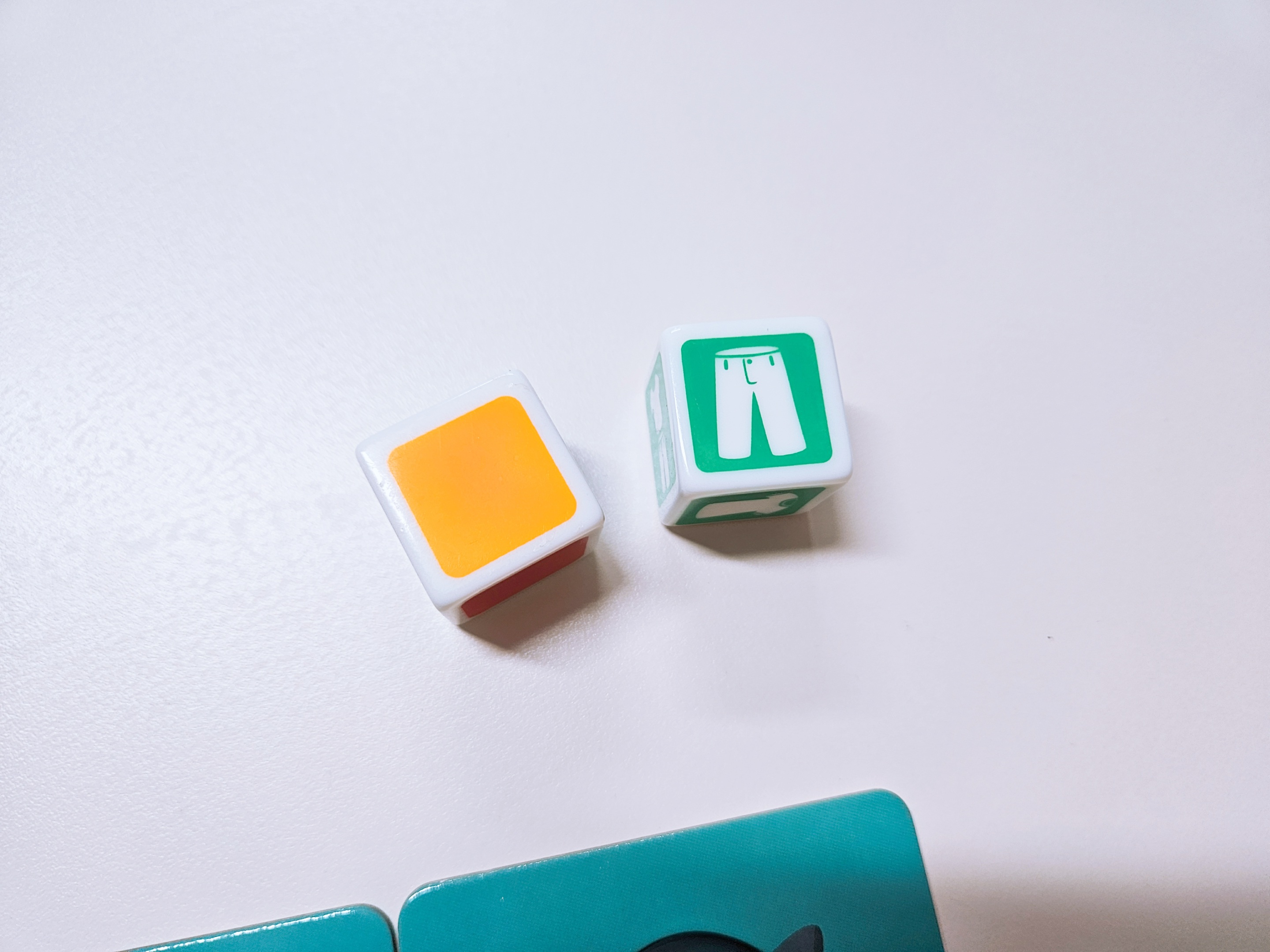 - 차례를 정한후 색 주사위와 코스튬 주사위를 던져 둘을 매칭 시킨 결과를 이야기 합니다.(예를 들어 노란색과 바지가 나왔다면 노란 하의의 카드를 찾으면 됩니다.)