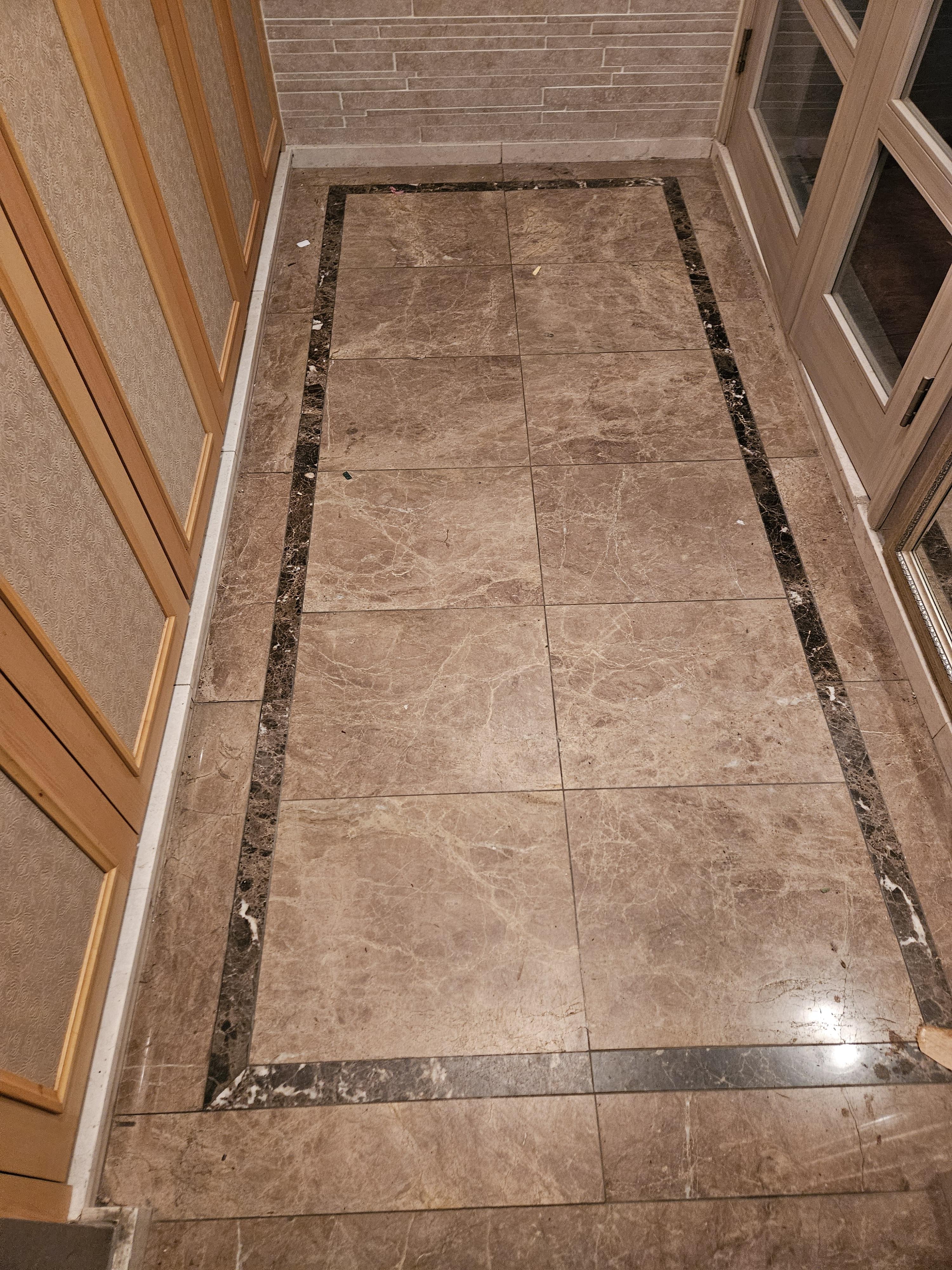 바닥 타일은 밝은 색의 무광으로 그레이베이지로 정했다. 타일은 600*600. 현관은 시원시원한 느낌이 들어야 하므로 600 타일을 포기하지 않았다. 원래 바닥 타일이 높낮이가 없이 평평했는데 단올림을 해서 중문 밖에서 신발을 신을 수 있게 설계하기로 했다. (어려운 시공이 아니라고 해서 바로 결정)