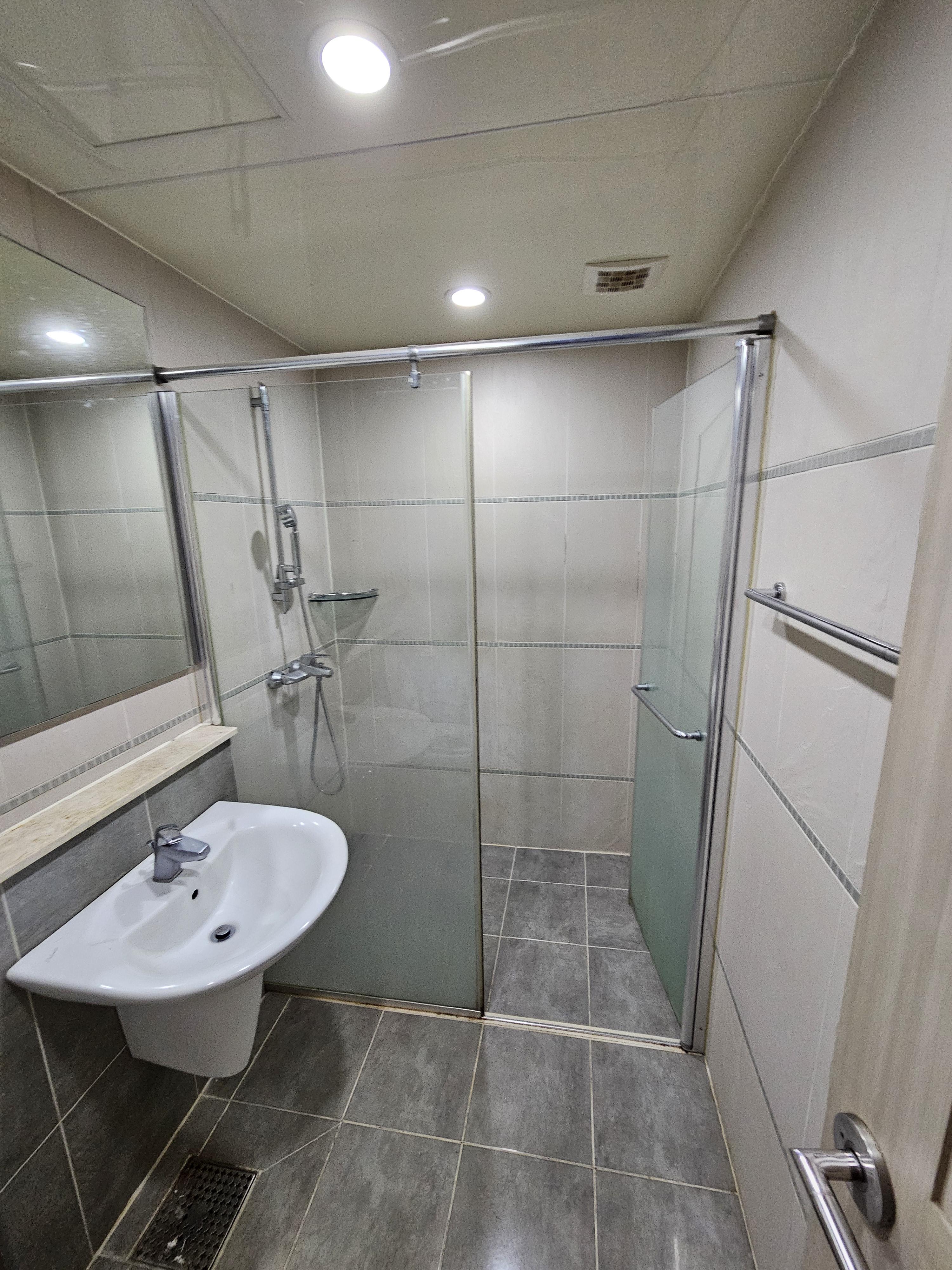 집이 올 화이트이기 때문에 조금 무게를 줄 수 있는 약간 더 진학생의 그레이, 베이지 계열을 골랐다. 화장실의 바닥은 300*300사이즈였는데 벽면의 600*300과 어울리는 타일을 고르자니 힘들었다.