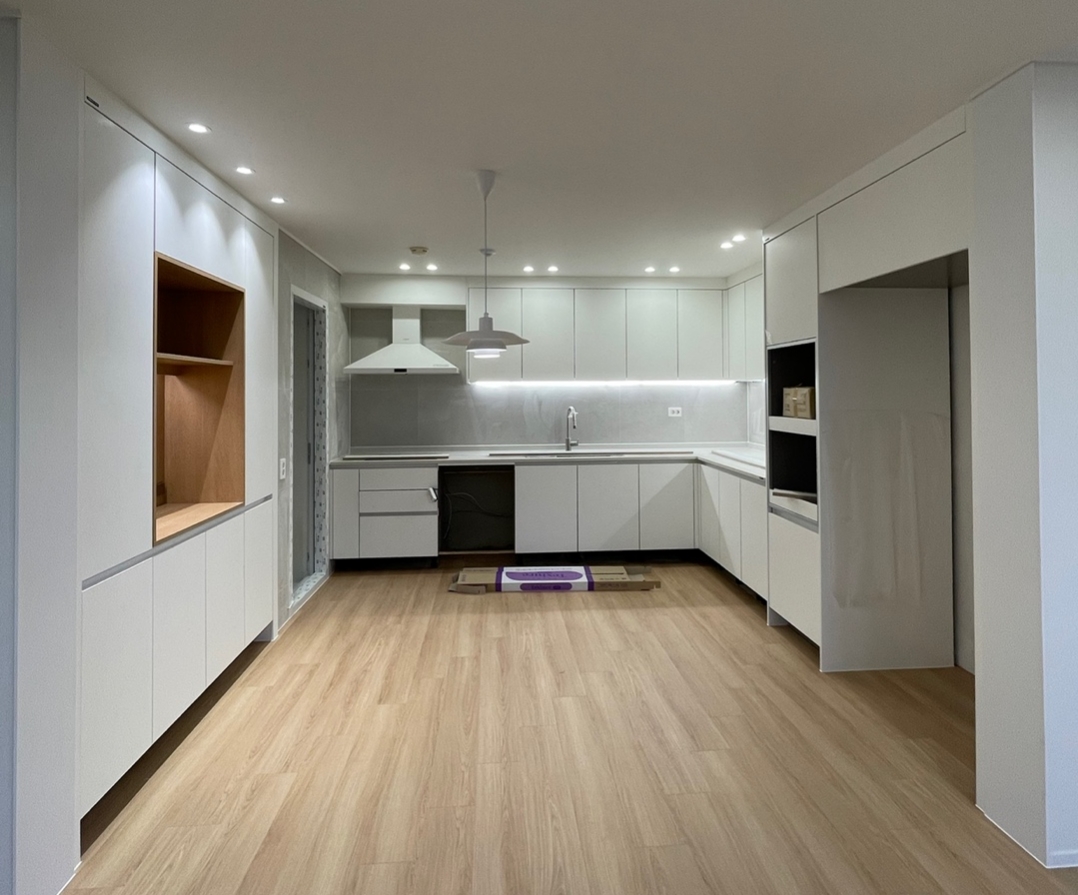 주방이 그러게 넓은 편이 아니라 처음에는 최대한 개방감을 주고 싶었다. 그래서 상부장을 없애면 어떨까 고민이 되었다. 홈바도 있고 주방 베란다에 보조 주방 싱크대도 있는지라 수납은 충분할 것 같았다.